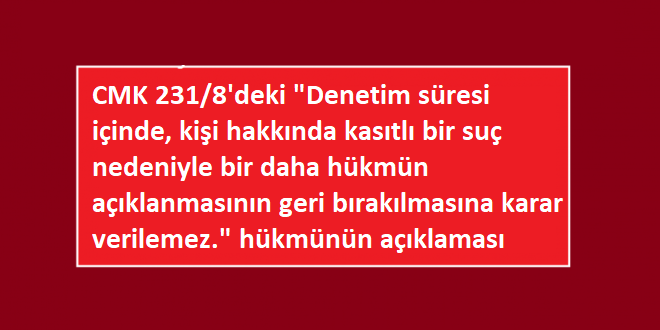 CMK 231/8’deki “Denetim süresi içinde, kişi hakkında kasıtlı bir suç nedeniyle bir daha hükmün açıklanmasının geri bırakılmasına karar verilemez.” hükmü nasıl anlaşılmalıdır?