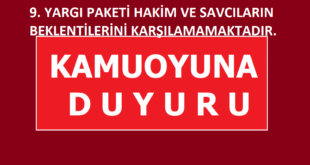 9. Yargı Paketinden beklentilerimiz: 1-Anayasa Mahkemesinin 2023/104 Esas, 2023/177 sayılı kararında belirttiği gibi 1. sınıf olsun olmasın, Yargıtay üyeliğine seçilme yeterliliği olsun olmasın tüm hakim ve savcılara maaş iyileştirmesi yapılması, 2-Hakim ve savcılar hakkında verilen disiplin cezalarının tüm hüküm ve sonuçlarıyla birlikte ortadan kaldırılması, 3-Toplu sözleşmeyle 5 yılda bir yapılan derece terfinin yapılması, 4-Hâkim ve savcılara yıpranma payı getirilmesi, 5-2008 …