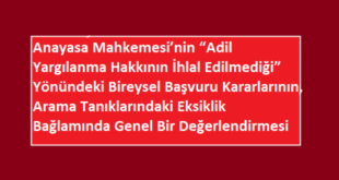 Anayasa Mahkemesi’nin “Adil Yargılanma Hakkının İhlal Edilmediği” Yönündeki Bireysel Başvuru Kararlarının, Arama Tanıklarındaki Eksiklik Bağlamında Genel Bir Değerlendirmesi Öz: Anayasa Mahkemesi’nin hakkın ihlal edilmediği yönündeki kararı, hak ihlali oluşturduğu iddia olunan işlemin hukuka aykırılığını ortadan kaldırmaz. Anayasa Mahkemesi’nin bireysel başvuru kararları yargı mercileri için de bağlayıcı olup, bu kararların sübjektif etkisi yanında, her ne kadar bu konuda görüş birliği mevcut …
